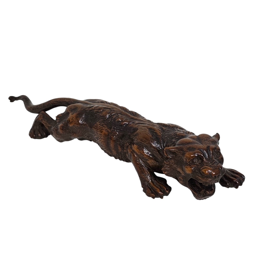 Escultura de madeira minuciosamente entalhadada representando pantera em posição de ataque. Medidas 12 x 62 x 16 cm.