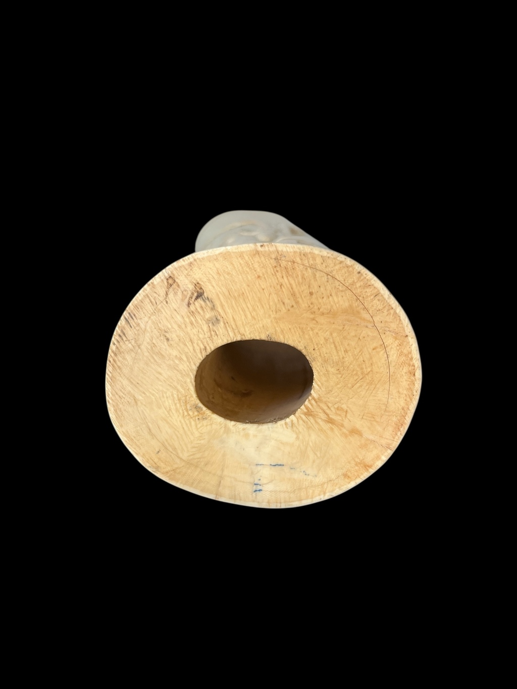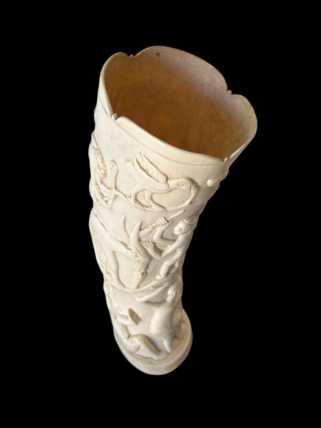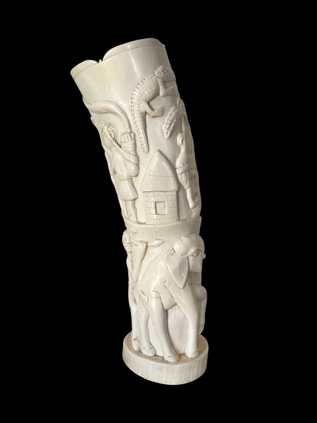 Grande presa de marfim tribal africano esculpido em relevo retratando personagens do cotidiano local. Medidas 47 x 14 x 12 cm.